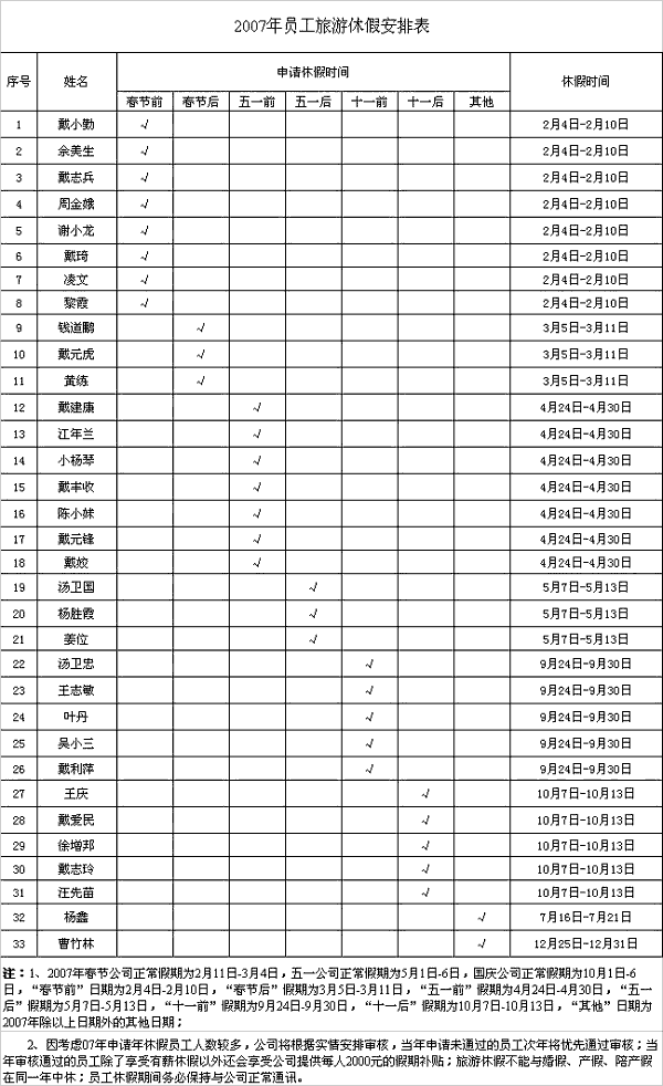 公司福利制度第十二条:在公司工作满两年以上的员工,每隔两年可向公司申请最多6个工作日的有薪旅游假期,并给予2000元的假期补贴。 根据以上规定,需要申请2007年年休假的员工须填写《2007年员工休假申请表》并上交至部门主管审批,最后由总经理亲自审批,经审核批准通过的员工将享受以上规定的所有福利。 现公报2007年度经审核批准通过的员工名单: