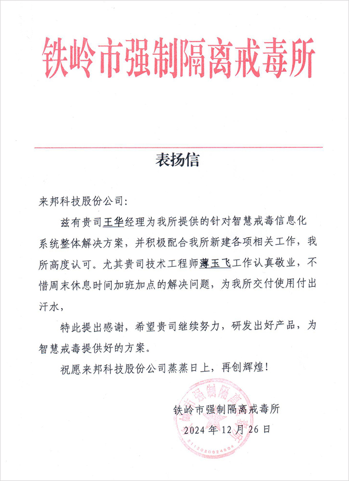 新闻中心 “信”任满载,实力赢赞。12月26日,辽宁铁岭市强制隔离戒毒所发来表扬信,对公司王华经理提供的智慧戒毒信息化系统整体解决方案,并积极配合该所新建各项相关工作,给予了高度认可。项目交付阶段,并对公司技术工程师薄玉飞工作认真敬业,不惜周末休息时间加班加点的解决问题,为按期按质交付使用付出汗水,提出感谢。