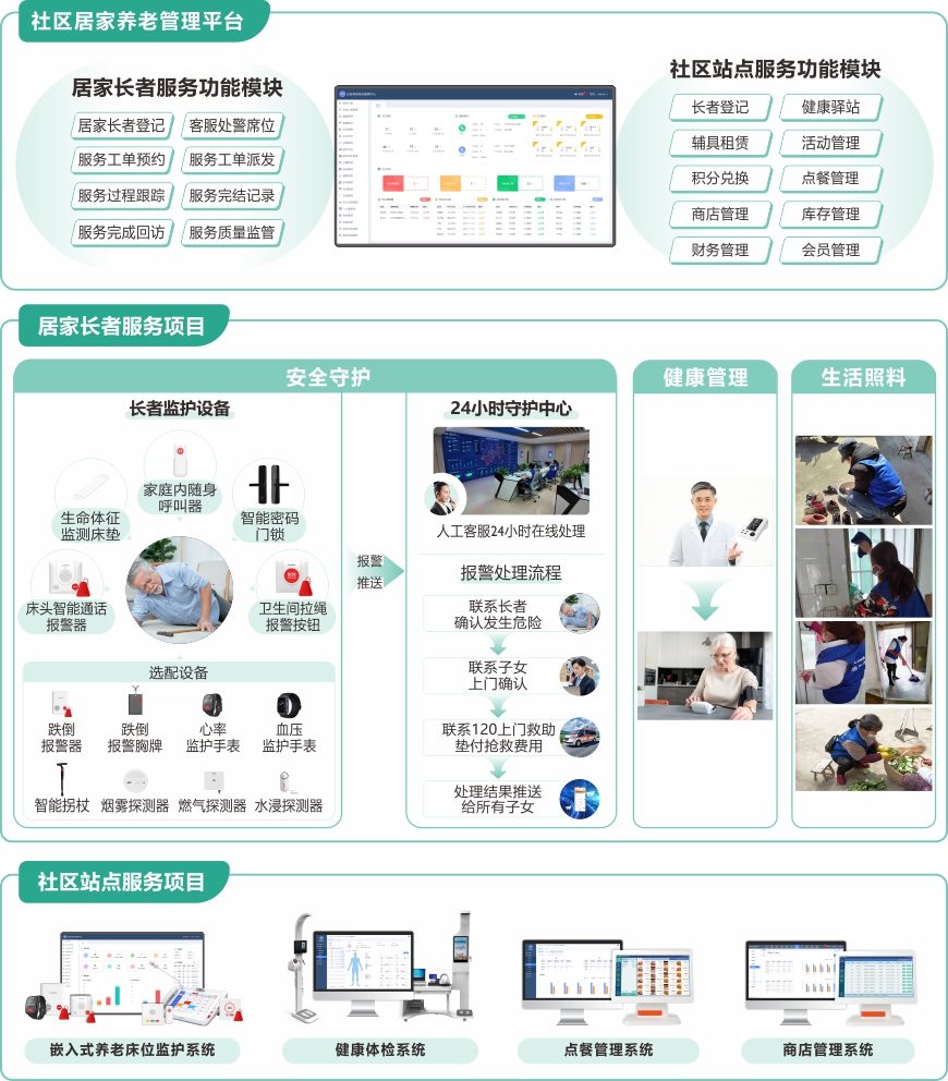 | 领导监管 | 综合信息大屏、健康数据大屏 长者地图大屏、视频监管大屏 设备监管大屏、适老改造监管 财务营收报表、充值统计报表 消费统计报表、服务质量报表 | ||||