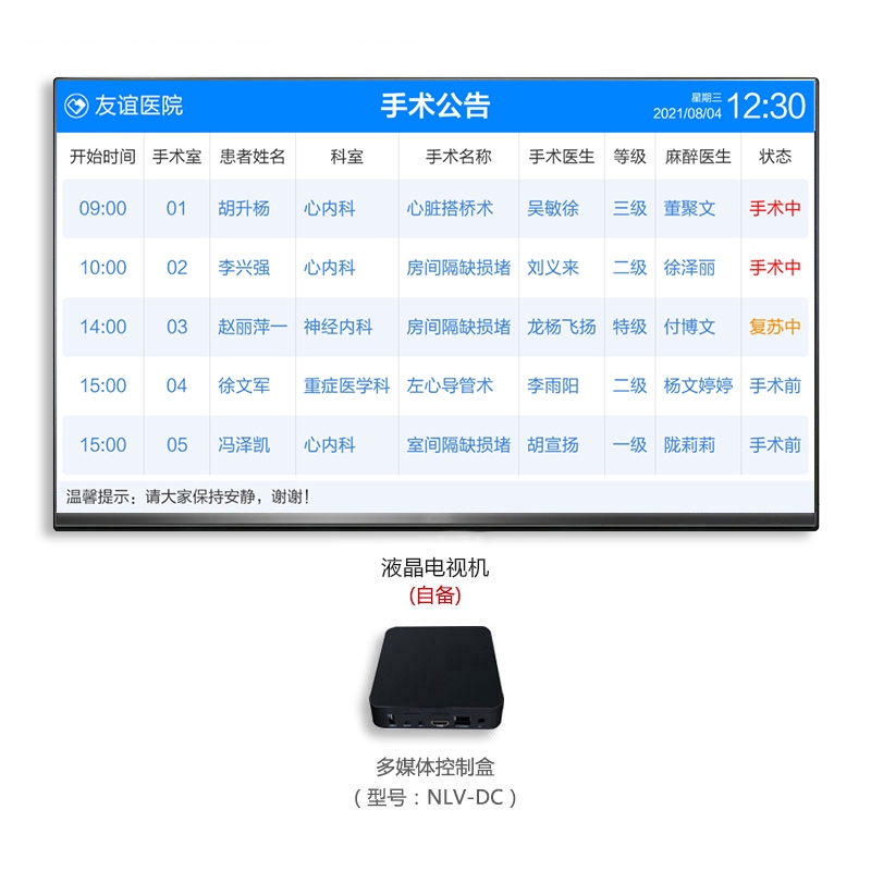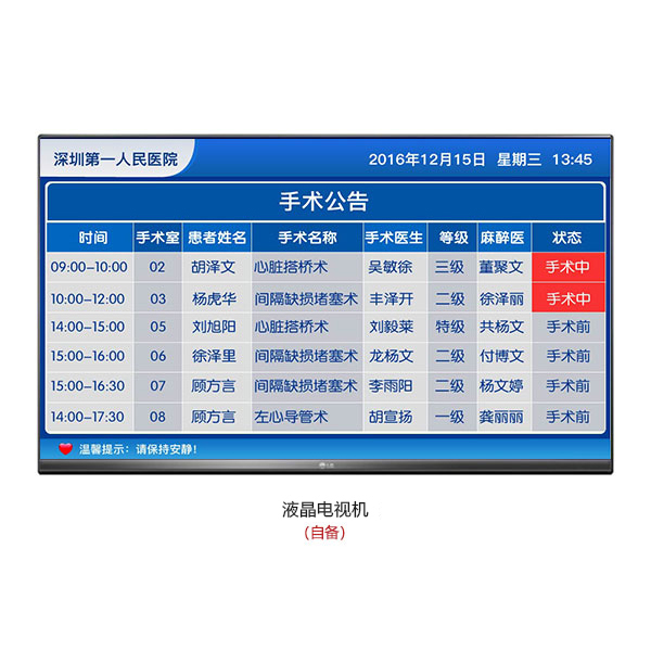 • 可作为手术公告显示屏使用,具有信息显示、数据同步等功能。