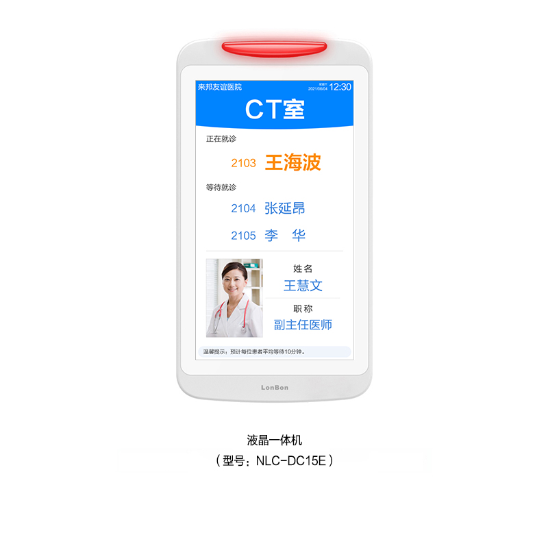 • 采用15.6英寸液晶显示屏,内置灯带双侧发光设计,壁挂式安装在体检室门口。