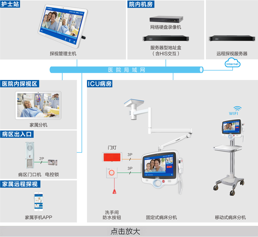 患者病情危重或手术后入住ICU病房,为了患者的早日康复,防止患者在院内受到外界感染的发生,ICU患者禁止家属陪护。由于家属、患者相互隔离,需要一套视频清晰度高、语音沟通顺畅的探视系统,为家属与患者间的提供便捷沟通的桥梁。