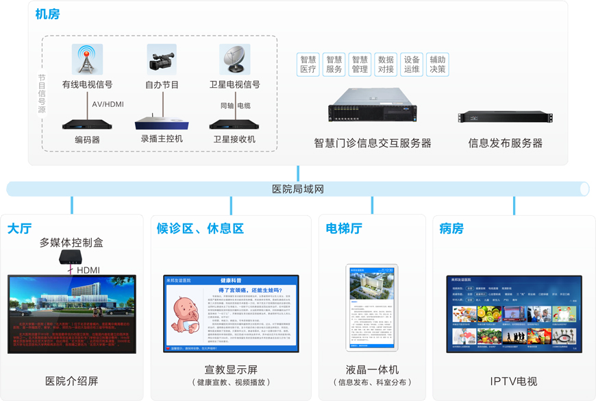 随着我国医疗建设的发展,营造良好的设施、幽雅的就医环境、提供优质的医疗服务已成为医院运营必不可少的手段。建立一套信息发布系统能够显著提升医院视觉环境,为患者就诊提供清晰明确的导引信息。
