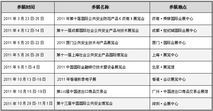 新闻中心 2011年第十一届成都国际社会公共安全产品与技术展览会将于4月12日-14日在四川省成都市举办,届时我公司参加,欢迎新老顾客莅临、参观指导。