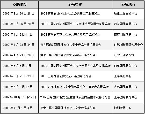 新闻中心 《2009第三届杭州国际社会公共安全产业博览会》与《2009第十届中国(武汉)国际公共安全技术及警用装备展览会》将于2009年3月26日-28日在杭州、武汉两地同期举办,届时我公司将同时参加,欢迎新老顾客莅临、参观指导。
